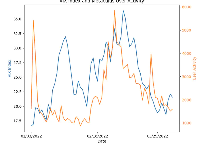 The main objective of this project is to elucidate the relationship between populace fear and the volatility of the US stock market. In this project we estimate market volatility via the VIX Index. Hosted by the Chicago Board Options Exchange, this ticker is a measure of 30-day volatility of the S&P500 index and is a standard indicator of overall market volatility. For more information about VIX Index, please see VIX Summary. To estimate populace fear, we look to user data on Metaculus, a community aggregation platform that utilizes users predictions to estimate the likelihood of real-world events. Historically, Metaculus viewership has spiked during times of political and global unrest with recent examples including the COVID-19 pandemic and the Russia-Ukraine conflict. By using these metrics as estimates of volatility and populace fear, we hope to gain insight into stock market dynamics and expose potential outperformance opportunities.