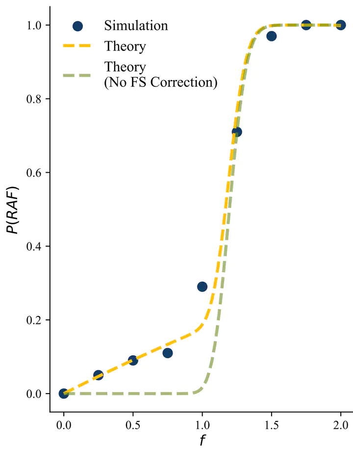 This paper presents an analytical model for the emergence of reflexively autocatalytic and food-generated (RAF) sets in Kauffman networks. The sharp transition in the probability of observing RAF sets as a function of catalytic probability is a well-documented but unexplained phenomenon. In this paper, we show that RAF formation proceeds through two regimes: a finite-size regime dominated by the probabilistic occurrence of minimal catalytic cores, and an asymptotic regime modeled by the disparity between the number of ways to select 𝑘 unique molecule-reaction pairs and the number of ways to allocate minimally RAF sets among them. This perspective on RAF theory offers new insights into the governing mechanics of autocatalytic emergence in Kauffman networks, particularly emphasizing the distinction between contributions arising from the underlying network structure and those from the catalytic model. The presented theory is applicable across a range of catalytic schemes, allowing for tractable analysis and a comparison of emergence behavior across a broad class of systems. The analytic description of this theory additionally provides a quantitative measurement of transition sharpness and predicts the scaling behavior of catalytic cores proportional to 𝑛2^(𝑛+1). Although this model advances the understanding of RAF set formation, it relies on the simplifying assumption of nonoverlapping catalytic cores. Future work should incorporate overlap probabilities and information on RAF core size distributions, and refine the restricted partition function to more accurately capture the behavior of RAF emergence.